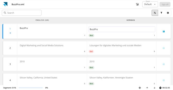 - Quality Score (Bad, Acceptable, Good, Best, Translation Memory).
